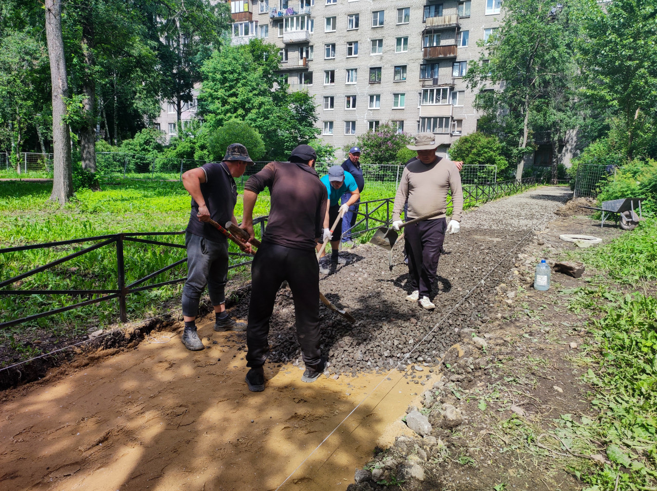 Перспективный вид на ремонтируемую дорожку в зелёном дворе: рабочие разбрасывают и разравнивают щебень по песчаному основанию, ориентируясь по натянутым шнурам для выдерживания уровня и ширины. В кадре видны лопаты, участок траншеи, металлическое ограждение вдоль тропы, а также бутыль с водой и тачка на заднем плане. Территорию окружают деревья, кустарники и многоквартирный дом с окнами. Фото подходит для иллюстраций о ремонте пешеходных дорожек, дворовых работах, поставках инертных материалов и технологиях благоустройства.