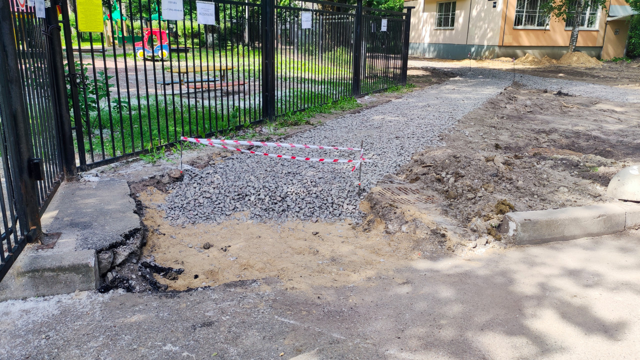 благоустройство благоустройство территории стройплощадка строительная площадка строительные работы строительство строительный участок город городская среда ремонт дорожные работы ремонт тротуара подготовка основания щебень отсыпка щебнем песок песчаная подушка вскрытие покрытия асфальт кромка асфальта бордюр ограждение металлический забор ворота сигнальная лента техника безопасности двор тень деревьев дневной свет инфраструктура коммунальные службы ремонт двораПохожие фотографии