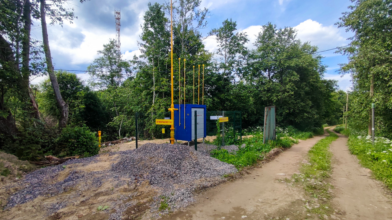 Газовый узел за ограждением у грунтовой дороги в зеленой зоне