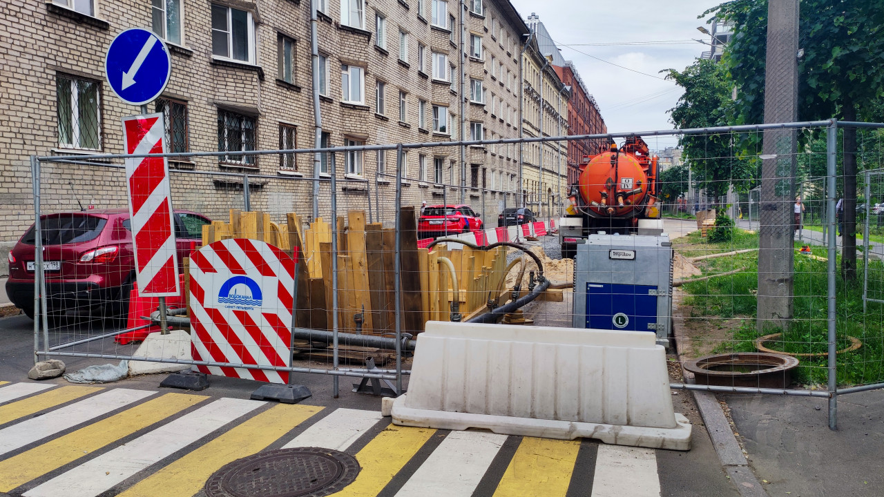 город городская инфраструктура коммунальные службы жкх ремонт обслуживание инженерные сети коммуникации раскопки траншея ограждение безопасность Санкт Петербург ЖКХ ремонт коммуникаций ремонт сетей водоканал Водоканал Санкт Петербурга аварийные работы котлован строительный забор дорожные барьеры сигнальные щиты временные знаки дорожные работы спецтехника вакуумная машина ассенизатор шланги деревянное крепление улица жилые дома пешеходный переход дорожная разметка люкПохожие фотографии