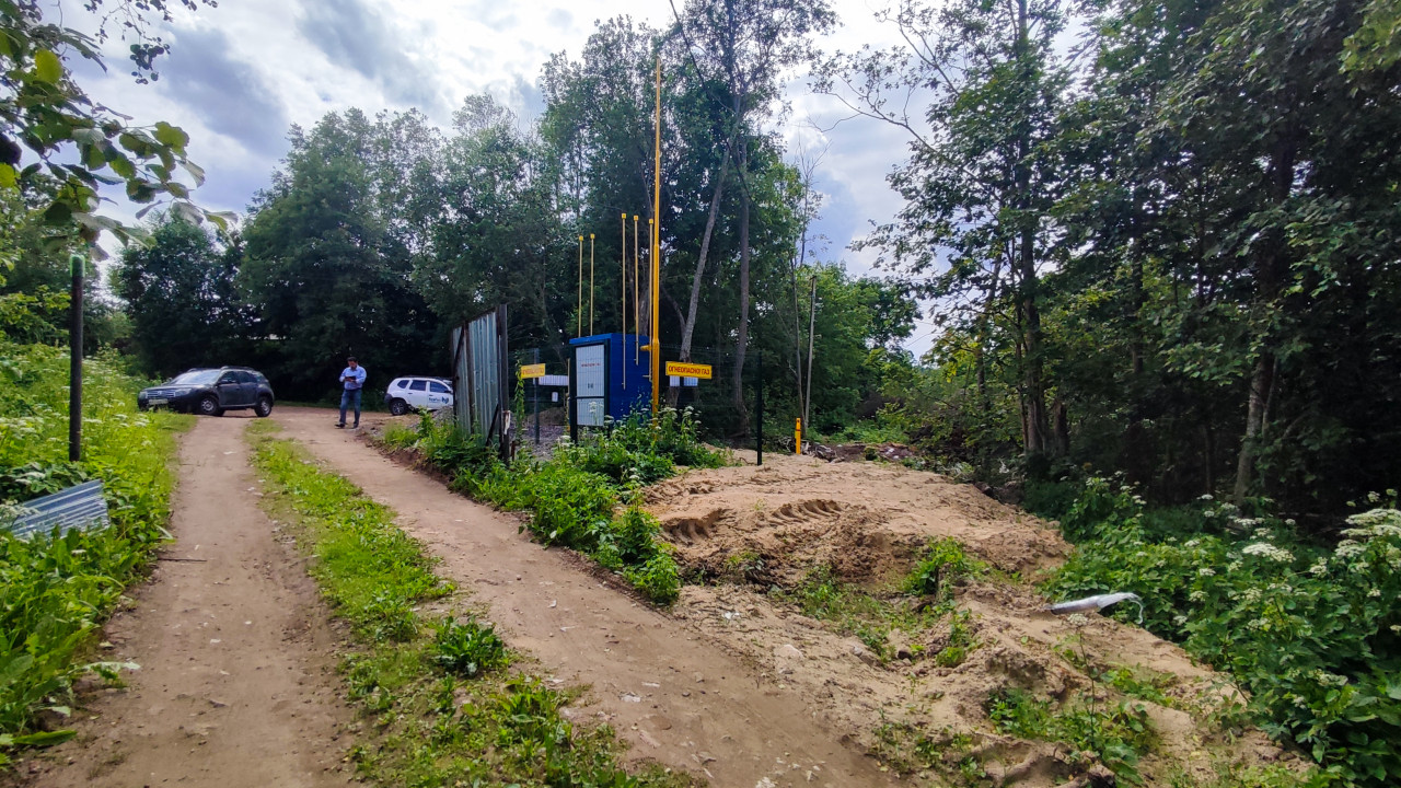 Подъезд к газовому объекту с раскопкой грунта и автомобилями на дороге