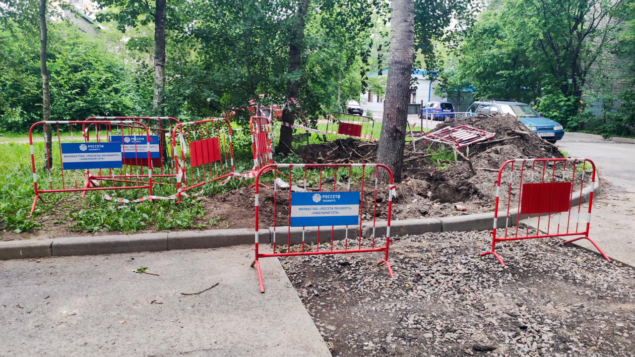 город городская инфраструктура коммунальные службы жкх ремонт обслуживание инженерные сети коммуникации раскопки траншея ограждение безопасность двор дворовой проезд дорожные работы раскопка земляные работы строительные барьеры сигнальная лента щебень грунт куча земли ремонт коммуникаций кабельные сети электроэнергия Россети Ленэнерго предупреждающий знак благоустройство инфраструктура деревья зелень припаркованные машины лето городское хозяйствоПохожие фотографии