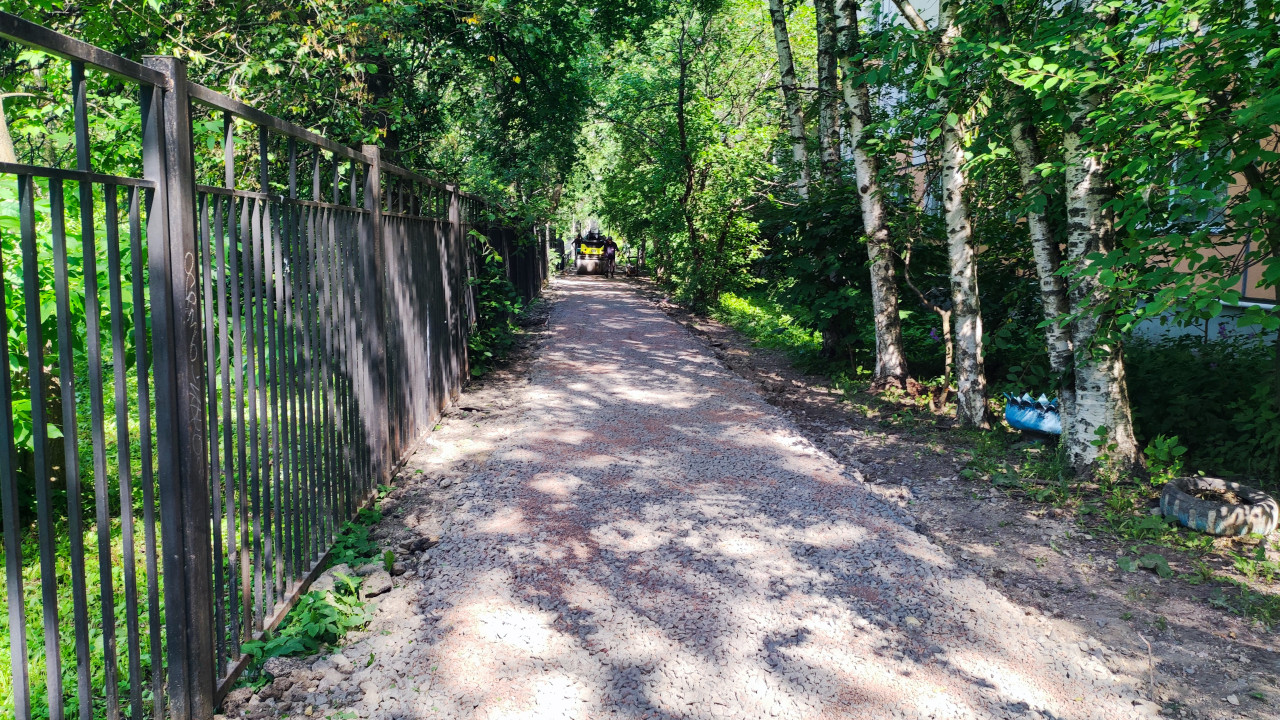 благоустройство благоустройство территории стройплощадка строительная площадка строительные работы строительство строительный участок городская среда ремонт дорожные работы пешеходная дорожка щебеночная дорожка щебень отсыпка выравнивание основание тропинка зеленая зона деревья березы кустарники тень от листвы лето дневной свет металлический забор ограждение двор территория у дома техника вдали коммунальные службы инфраструктура ремонт дорожек парк перспективная линияПохожие фотографии