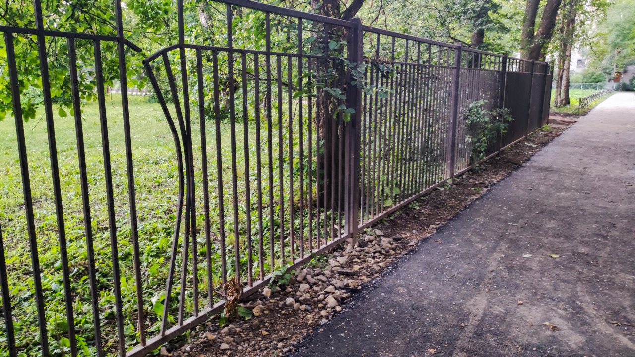 Деформированная секция металлического забора вдоль тротуара во дворе