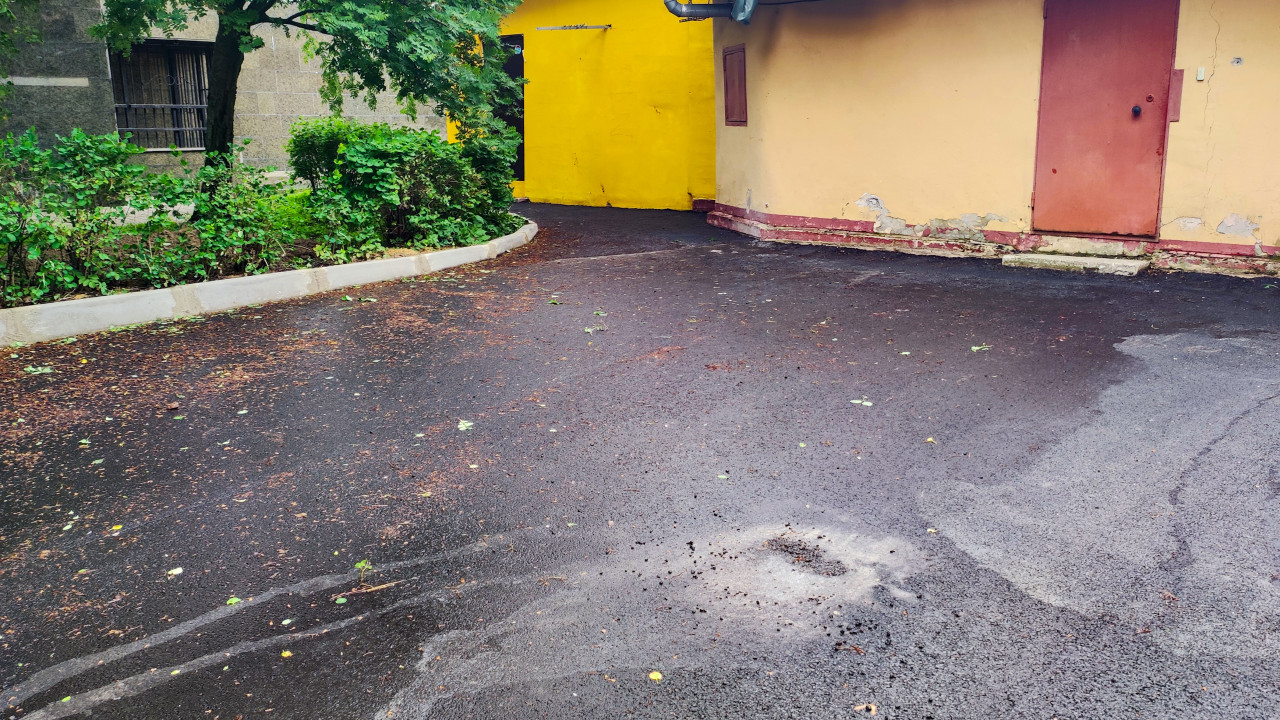 Свежий асфальт у стены жилого дома с жёлтыми воротами и следами ремонта покрытия