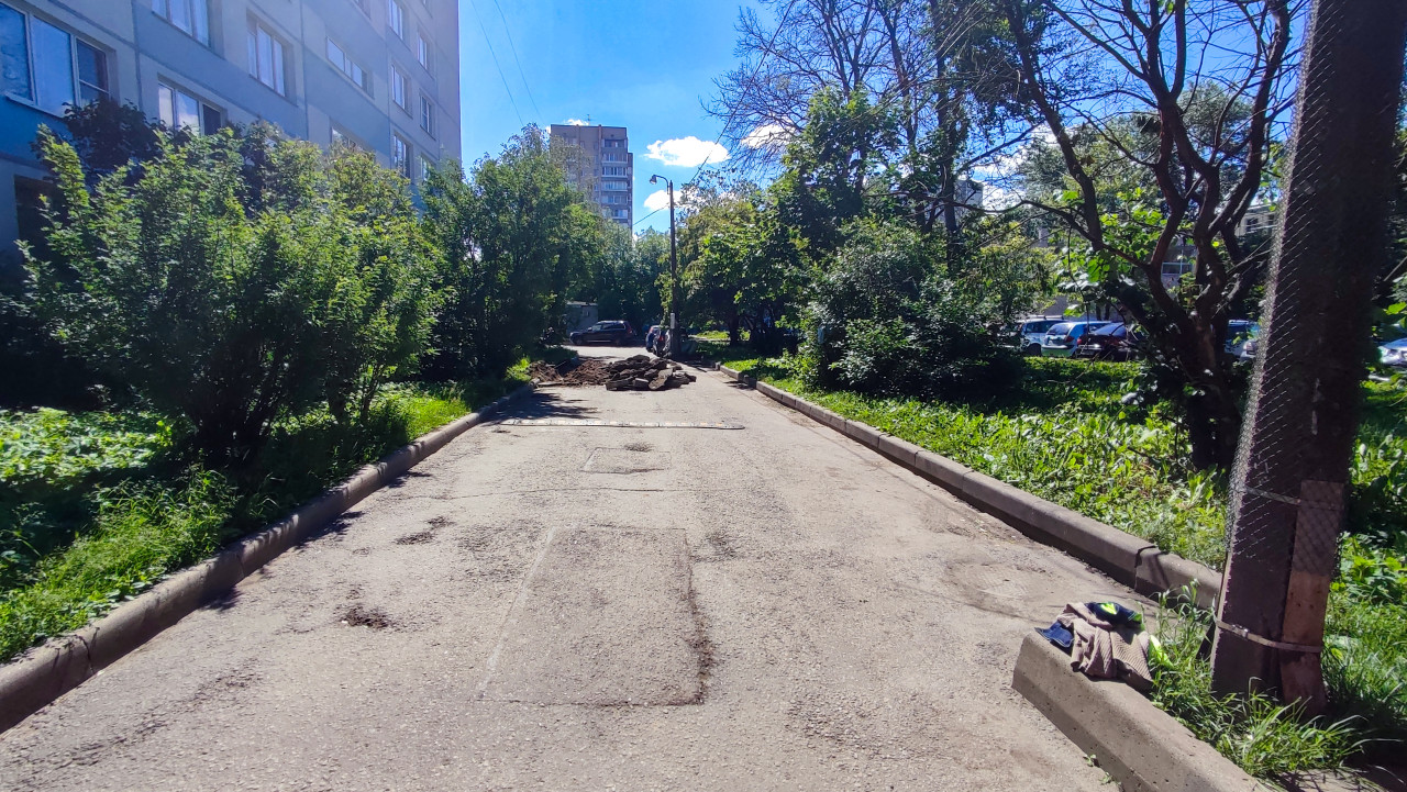 Внутридворовая дорога с заплатками асфальта и кучей снятого покрытия на фоне зелёных насаждений