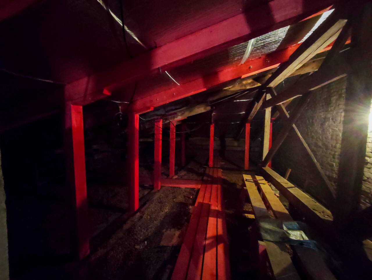 Внутренний вид низкого подкровельного пространства: установлены временные деревянные стойки и ригели, окрашенные в красный цвет, часть конструкций усилена раскосами. На полу видна насыпь и строительные остатки, вдоль прохода лежат сложенные доски, справа прислонены длинные элементы настила. На потолке заметны фольгированный утеплитель и фрагменты деревянных балок, у стены читается кирпичная кладка. Освещение точечное, интерьер тёмный, что характерно для чердачных работ. Фото подходит для материалов о ремонте перекрытий, усилении конструкций и организации временных опор на объекте.