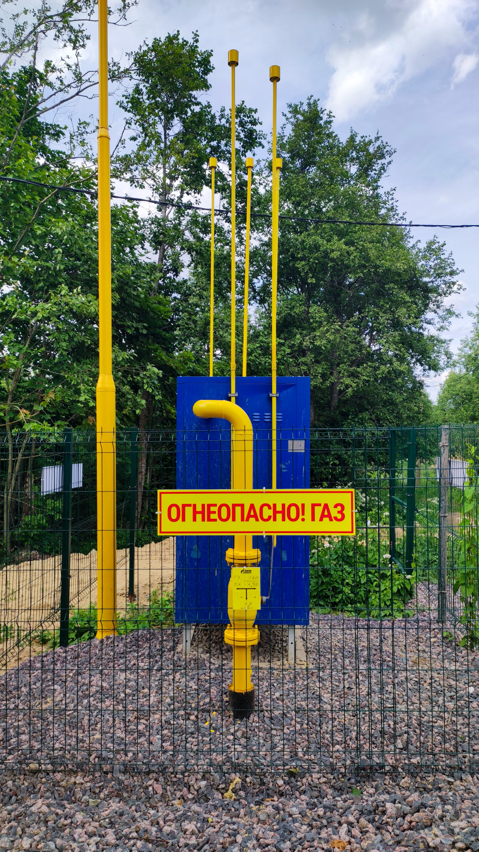 Желтый газопровод и знак «Огнеопасно! Газ» у синего шкафа оборудования