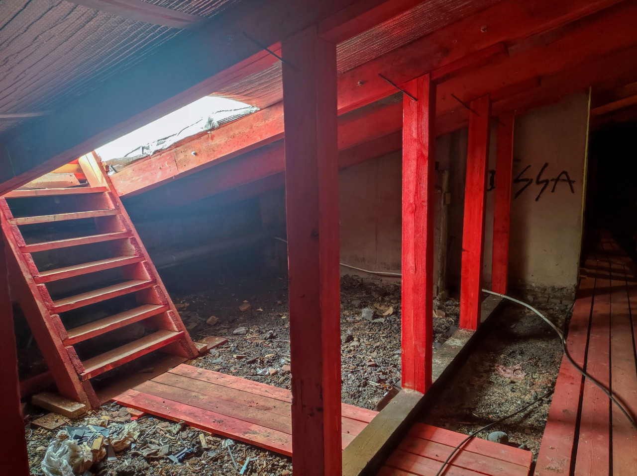 Чердачное помещение с красными подпорками, деревянной лестницей к проёму и строительным мусором на полу