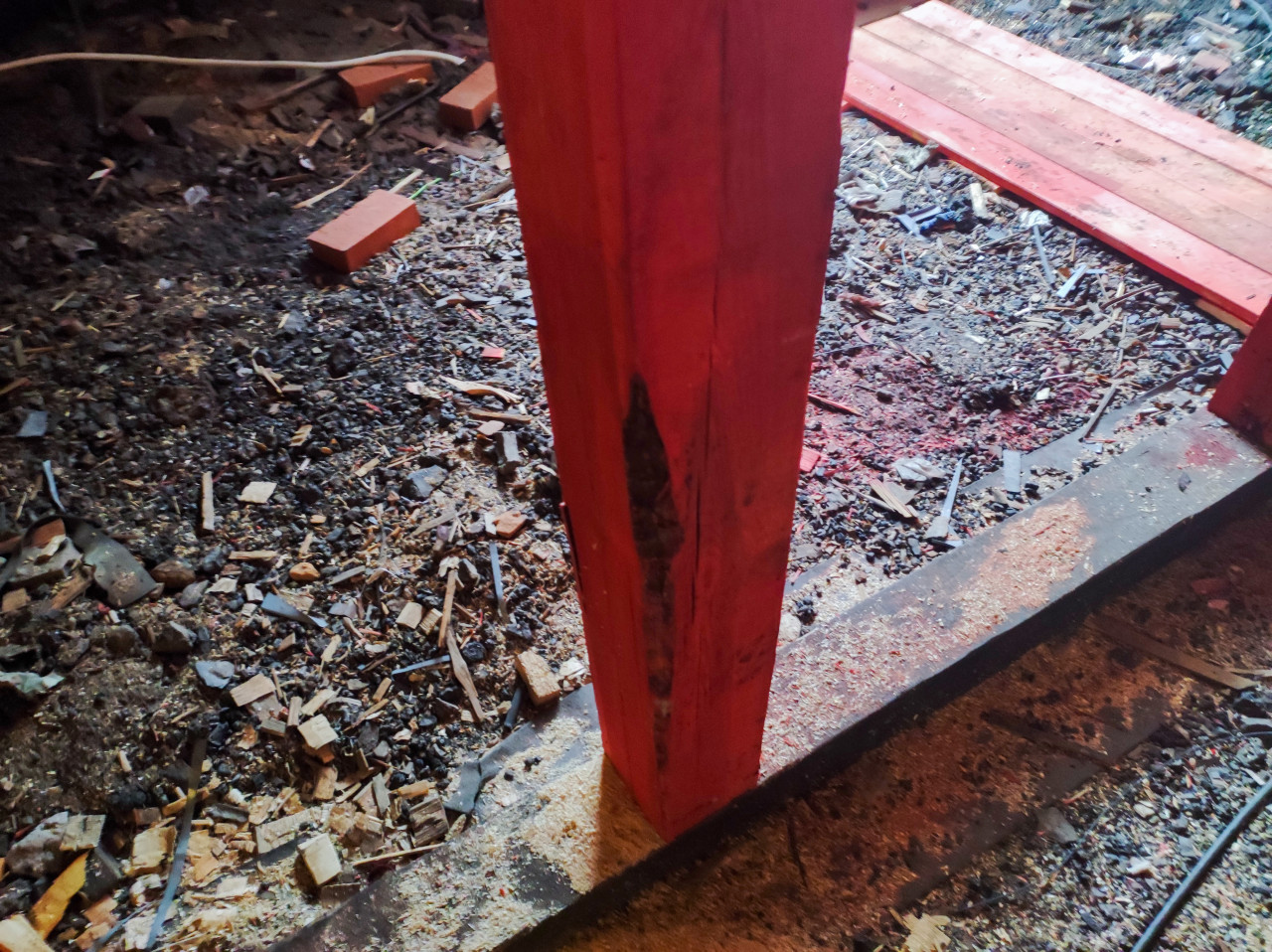 Детальная фотография временной деревянной стойки, окрашенной в красный цвет: на поверхности видно продольное повреждение и скол, у основания заметна древесная пыль и следы распила. Стойка установлена на тёмной балке или лежне, вокруг лежат обломки, щепа, куски кирпича и мелкий мусор, рядом проходит кабель. На заднем плане виден участок настила из досок, освещённый дневным светом. Кадр фиксирует состояние элемента временного усиления и рабочие условия на объекте ремонта. Подходит для материалов о контроле качества, технике безопасности, дефектах древесины, ремонте перекрытий и строительных процессах.