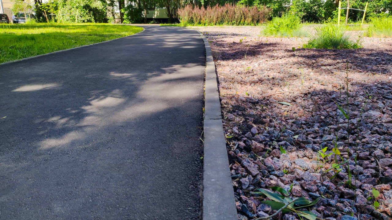 благоустройство благоустройство территории стройплощадка строительная площадка строительные работы строительство строительный участок инфраструктура городская среда пешеходная дорожка асфальт асфальтовое покрытие бордюр бордюрный камень кромка дорожки поворот дорожки перспектива низкий ракурс текстура асфальта ландшафт озеленение каменная отсыпка декоративный щебень мульча грунт сорняки молодые растения газон тени деревьев солнечный свет лето отделение зон устройство дорожек ландшафтные работы контроль качестваПохожие фотографии