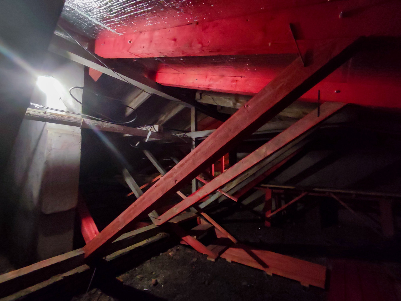 Съёмка внутри чердачного пространства: под кровлей видны массивные деревянные балки, окрашенные в красный цвет, а ниже — перекрещивающиеся стропила и доски, часть из которых лежит в беспорядке на полу. Слева светит лампа, заметны провода и кабели, пыль и мелкий мусор. Кадр передаёт конструкцию перекрытий и состояние деревянных элементов под крышей при искусственном освещении. Фото подходит для материалов о ремонте кровли, обследовании зданий, строительных работах и технике безопасности.