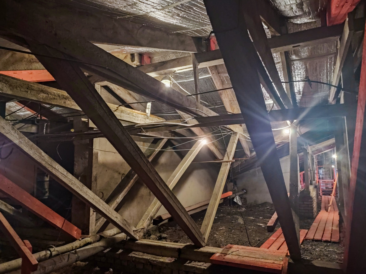 Система деревянных подпорок и раскосов на чердаке при ремонтных работах
