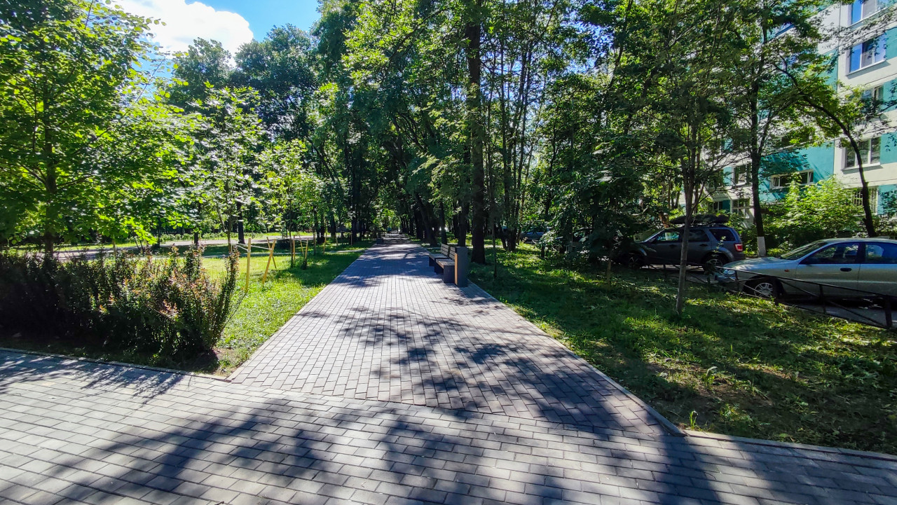 Пешеходная аллея из тротуарной плитки с лавочками и деревьями рядом с жилым домом