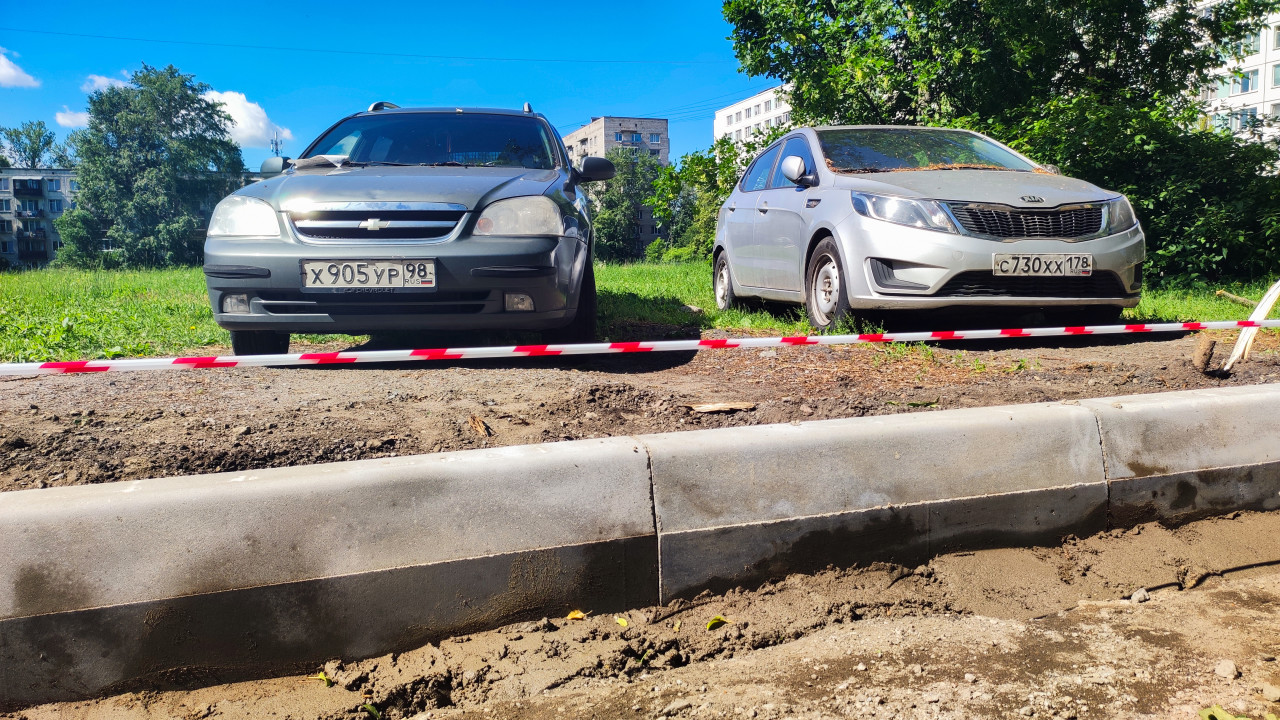 дорога дороги дорожные работы инфраструктура строительные работы строительство строительство дорог город двор жилой квартал благоустройство ремонт ограждение сигнальная лента временное ограничение бордюр тротуар грунт земля парковка припаркованные машины легковой транспорт газон деревья кусты многоэтажный дом городская инфраструктура лето солнечный день тени провода Санкт Петербург регион 78Похожие фотографии