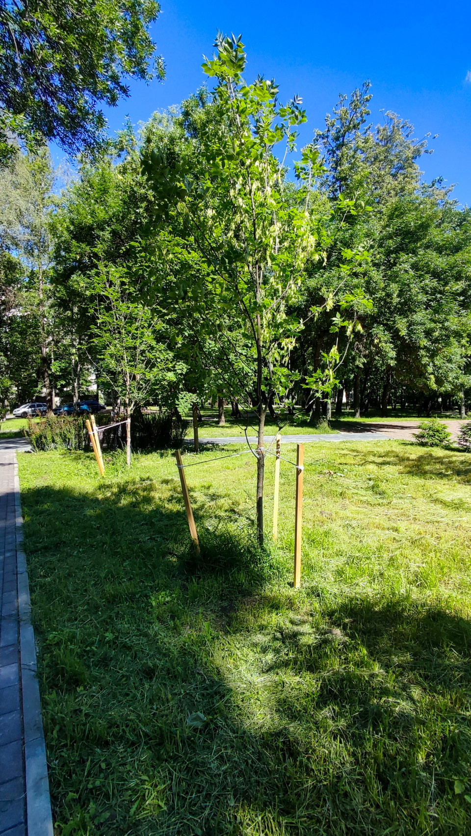 На газоне стоит молодое дерево, закреплённое тремя деревянными колышками и растяжками. Вокруг видна свежескошенная трава, по краю проходит дорожка из плитки, вдалеке просматриваются кусты и кромка асфальтовой дорожки. Фон составляют взрослые деревья и зелёная территория двора, небо ярко-синее, освещение контрастное, с тенями от листвы. Кадр иллюстрирует посадку и адаптацию деревьев в городской среде. Фото можно использовать для материалов об озеленении, уходе за насаждениями и благоустройстве парков и дворов.