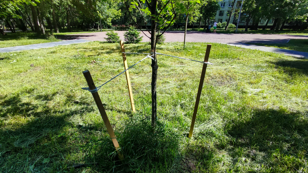 благоустройство благоустройство территории стройплощадка строительная площадка строительные работы строительство строительный участок город озеленение посадка саженец молодое дерево ствол колышки опоры растяжки фиксация дерева подвязка садовые работы уход за растениями газон скошенная трава зеленая зона двор парк дорожка асфальт тротуар тень солнечный день лето коммунальные службы ландшафтные работы городская инфраструктураПохожие фотографии