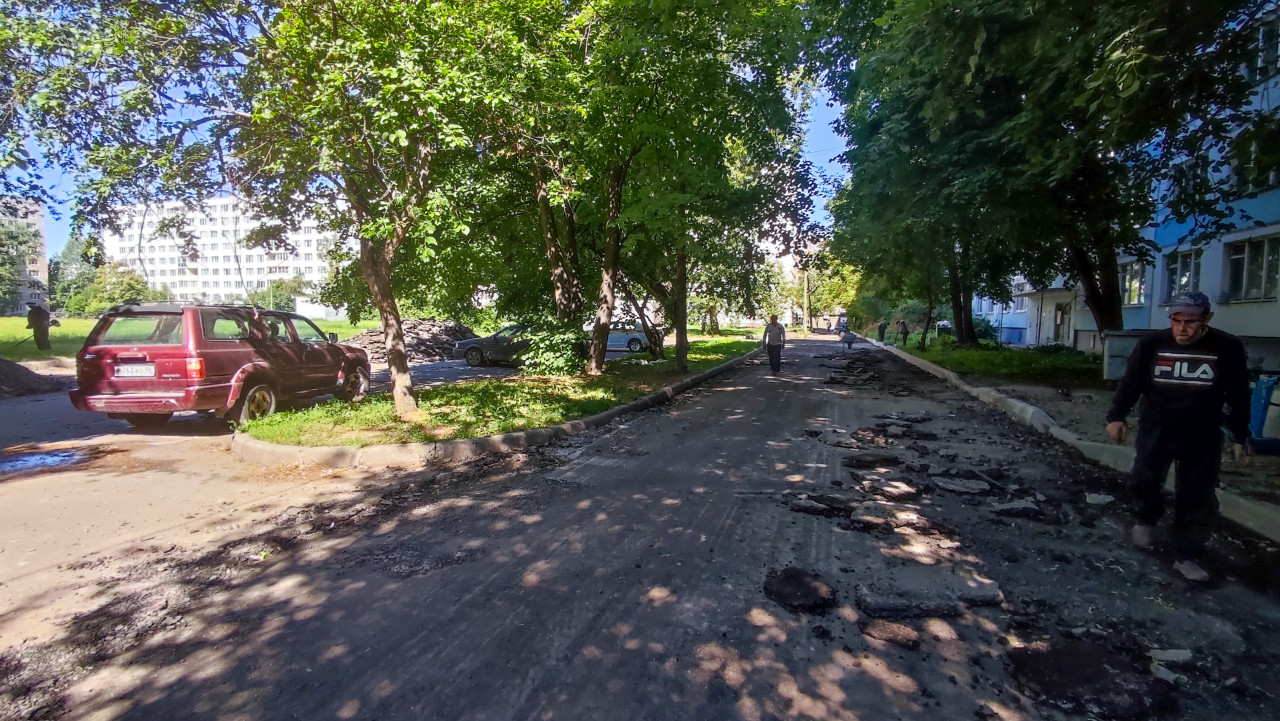 Дворовой проезд после снятия асфальта с крошкой и кусками покрытия под деревьями