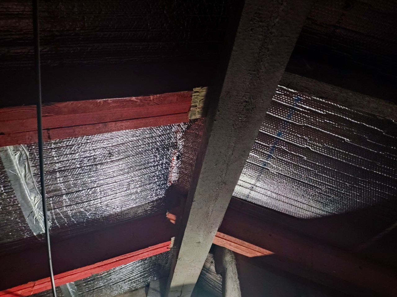 Кровельная конструкция с фольгированным утеплителем, красными балками и кабелем