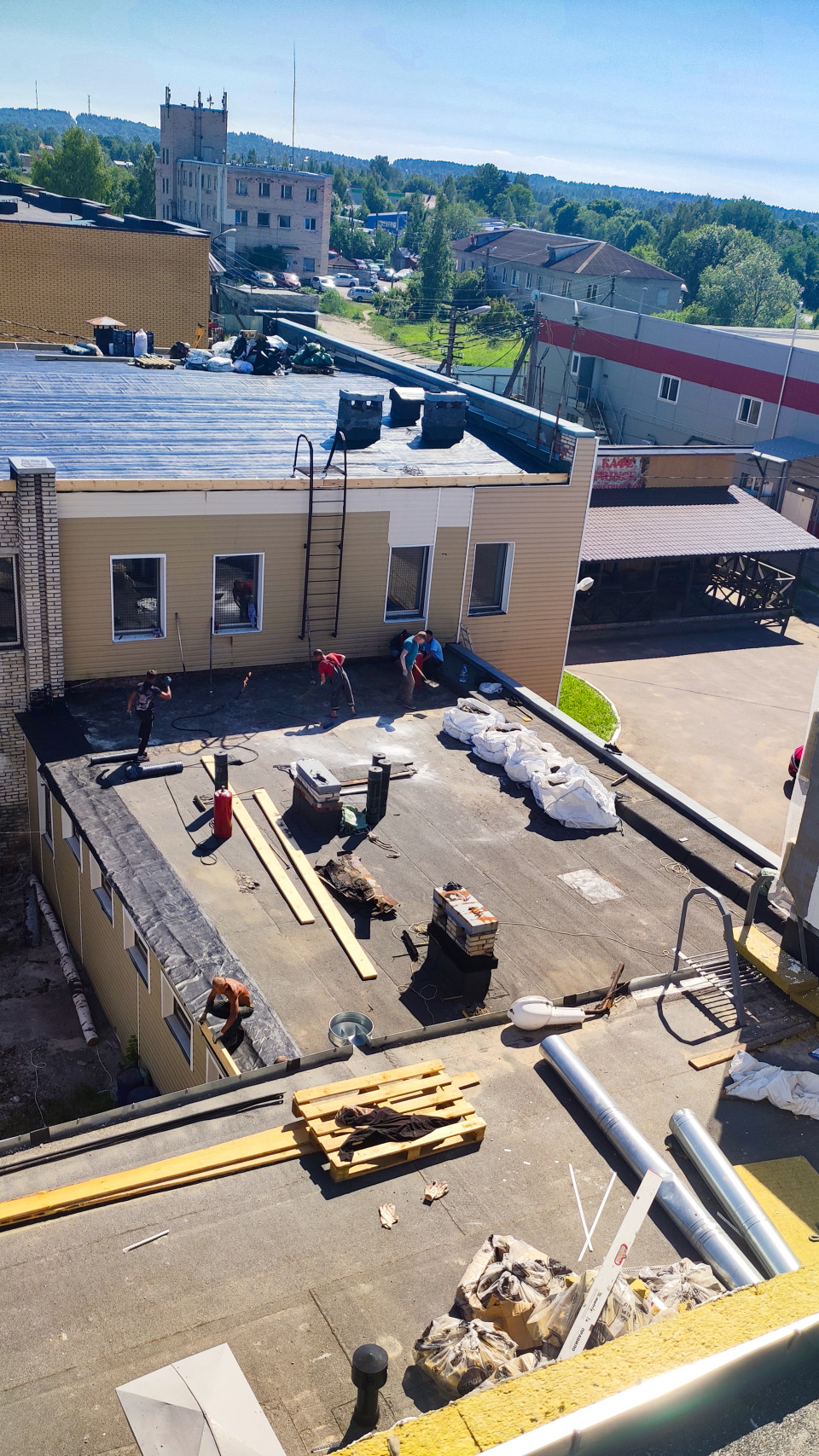крыша ремонт крыши крыша здания износ кровельные работы ремонт кровли повреждения крыши кровля кровельное покрытие крыша дома строительство ремонт капитальный ремонт плоская кровля гидроизоляция рулонная гидроизоляция наплавляемая кровля рабочие бригада спецодежда инструмент газовый баллон рулоны строительные материалы мешки деревянные рейки примыкания кромка кровли вентиляционные выходы лестница техника безопасности городской вид лето солнечный деньПохожие фотографии