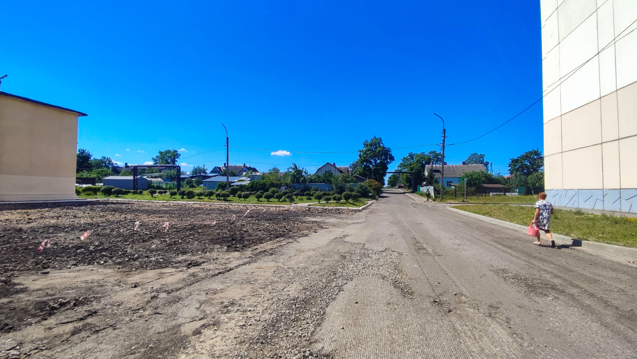 Дорога со снятым слоем асфальта у промышленных зданий с пешеходом на обочине