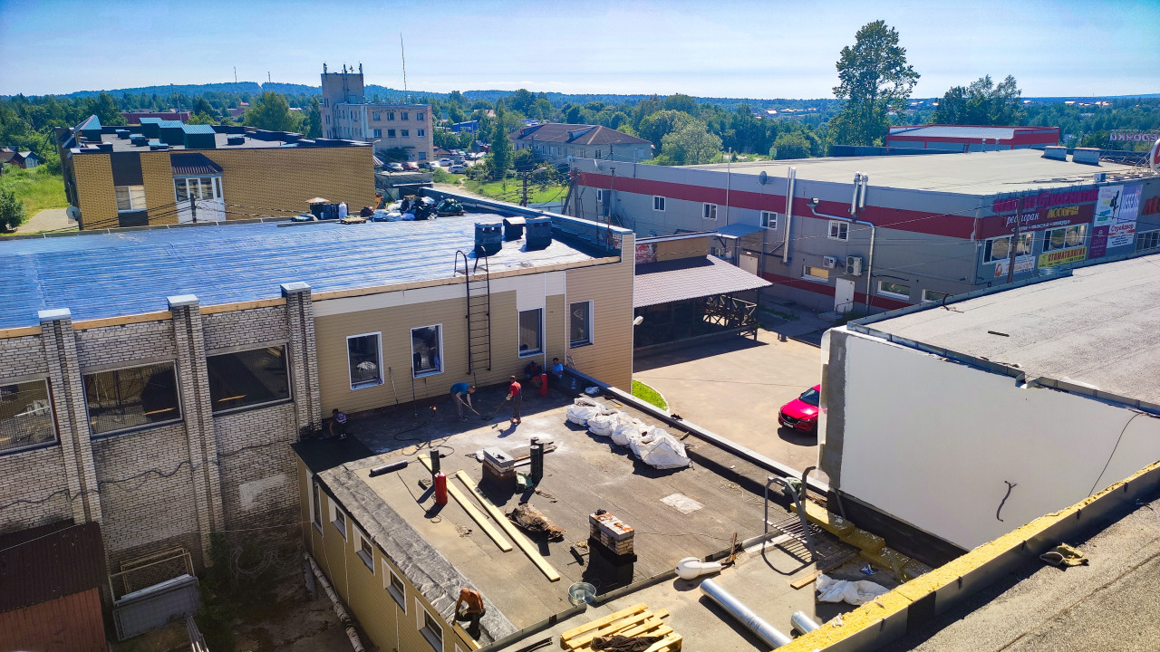 крыша ремонт крыши крыша здания износ кровельные работы ремонт кровли повреждения крыши кровля кровельное покрытие крыша дома строительство плоская кровля промышленное здание склад коммерческая недвижимость рабочие бригада стройплощадка строительные материалы мешки рулоны поддоны доски воздуховоды вентиляция вентиляционные выходы инженерные системы гидроизоляция парапет лестница двор автомобиль реклама на фасаде городская окраина панорама лето июнь 2024 лесПохожие фотографии
