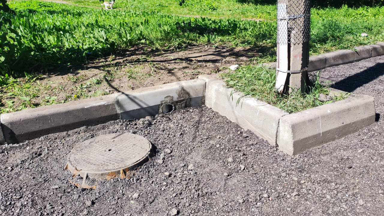 Июнь 2024, двор: в кадре бетонный бордюр образует угол, в его основании видна круглая водоотводная труба, выходящая в понижение. Рядом расположен люк на низкой металлической горловине, вокруг рассыпан щебень и мелкий камень, заметны следы свежих работ по подсыпке и выравниванию. Справа стоит опора с защитной сеткой и стяжками, по краям растёт трава и сорняки. На заднем плане зелёный газон и тропинка. Фото подходит для материалов о ливневом водоотводе, ремонте дворовых покрытий и инженерной инфраструктуре.