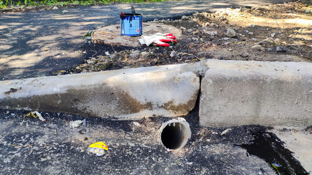 благоустройство благоустройство территории стройплощадка строительная площадка строительные работы строительство строительный участок городская инфраструктура ремонт бордюр бордюрный камень трещина бордюра ливневая канализация ливневка водоотвод дренаж дренажная труба труба асфальт влажное пятно потеки люк крышка люка ведро рабочие перчатки грунт земля ремонт тротуара дворовая территория коммунальные работы ремонт покрытия инженерные сети летоПохожие фотографии