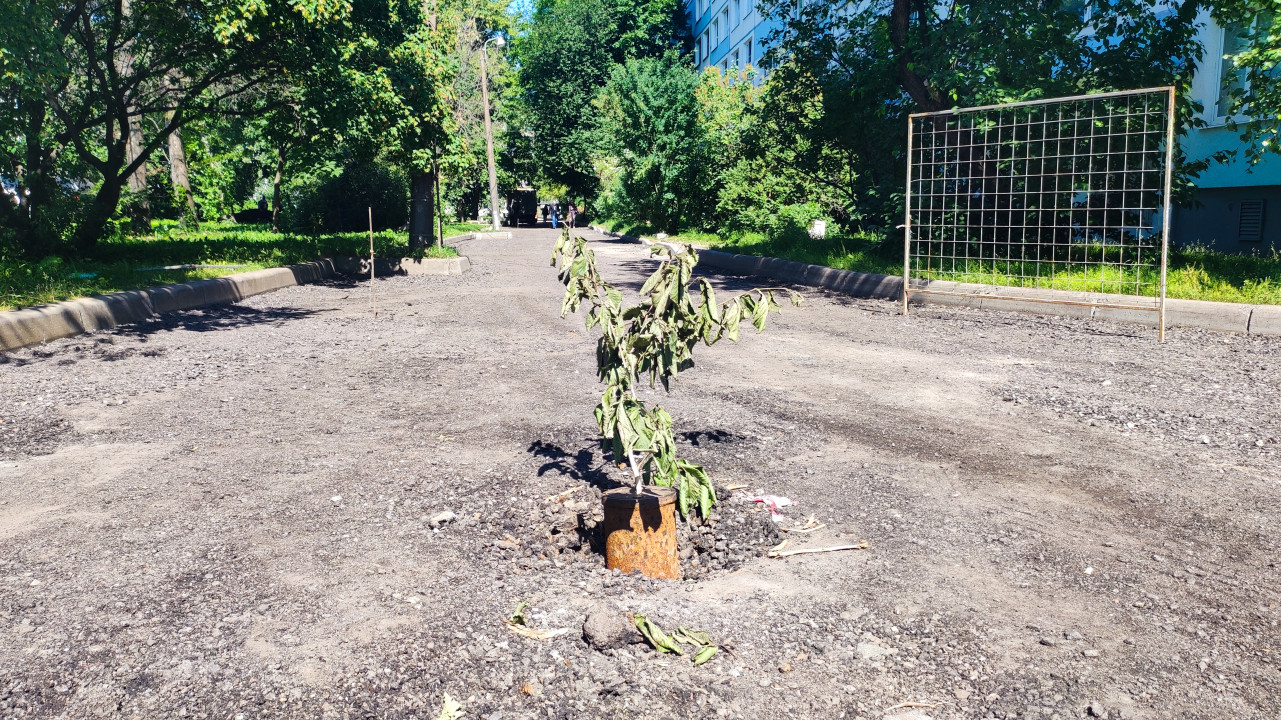 Июнь 2024, жилой двор: на месте старого асфальта видна тёмная щебёночная подушка и неровная поверхность после снятия верхнего слоя покрытия. В центре кадра оставлен пенёк с временно вставленным саженцем, листья поникли от жары. По краям идут бордюры, справа установлена секция временного сетчатого ограждения, в глубине заметна техника и люди. Вокруг густая зелень и фасад здания. Снимок подходит для материалов о ремонте дворовых дорог, подготовке основания под асфальт и организации работ в жилых кварталах.