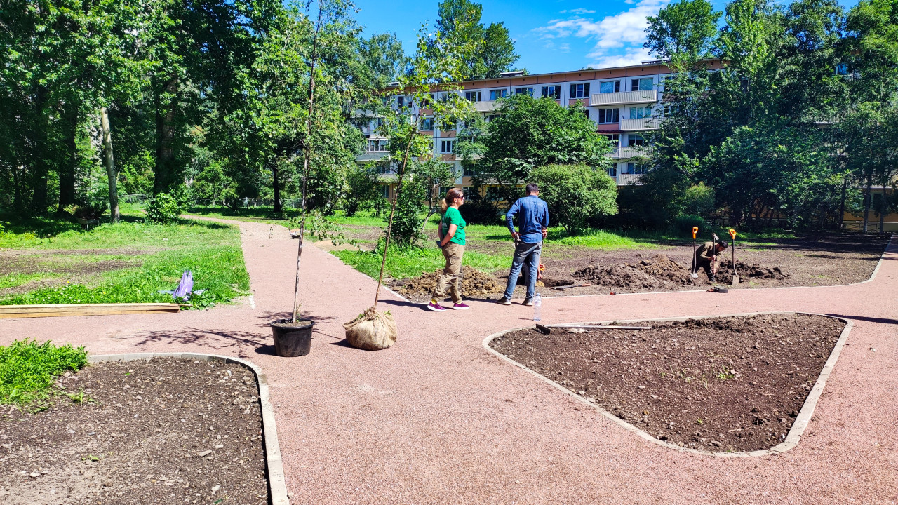благоустройство благоустройство территории стройплощадка строительная площадка строительные работы строительство строительный участок город двор озеленение посадка деревьев саженцы саженец в горшке корневой ком мешковина ландшафтные работы рабочие лопаты грунт куча земли пешеходные дорожки тротуар бордюр городской парк зелёный газон деревья жилой дом многоквартирный дом лето солнечный день городская инфраструктура благоустройство двора Санкт ПетербургПохожие фотографии