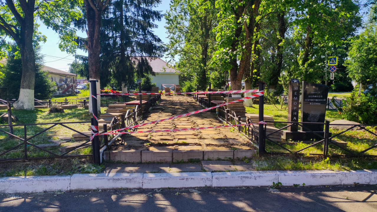 Закрытая на ремонт аллея мемориала памяти Великой Отечественной войны со стопками плитки