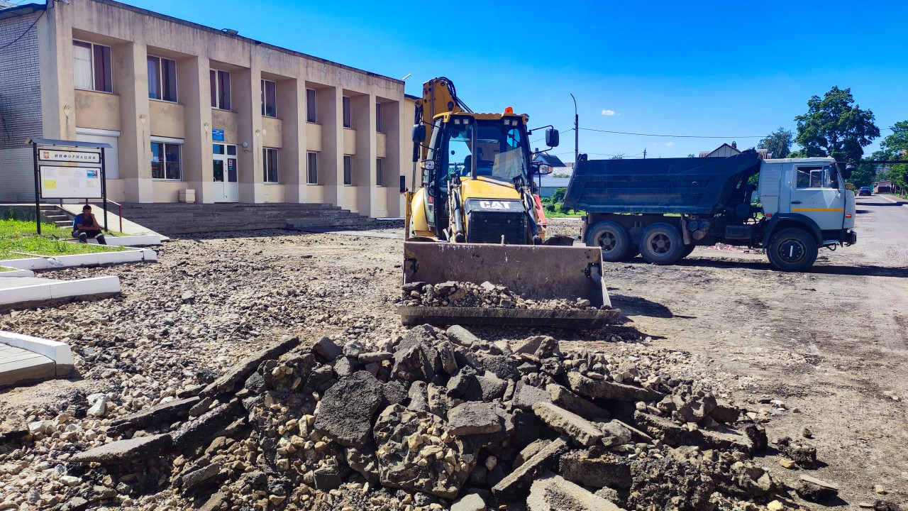 Фотография показывает строительную площадку: на переднем плане лежит крупная куча щебня и земли, на фоне работает фронтальный погрузчик с поднятым ковшом, рядом стоит самосвал для вывоза или подвозки материалов. Покрытие площадки неровное, с камнями и следами техники; слева виден фасад большого здания и лестничный вход. Освещение яркое, дневное, по погоде это летний период. Снимок можно использовать в материалах о дорожных и строительных работах, логистике сыпучих материалов и спецтехнике.