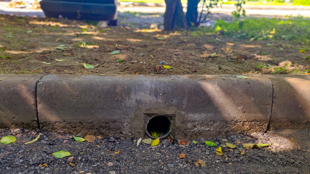 Дренажная труба в бетонном бордюре на краю дворового проезда