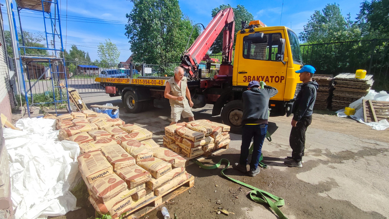 Разгрузка мешков Vetonit с краном-манипулятором на стройплощадке