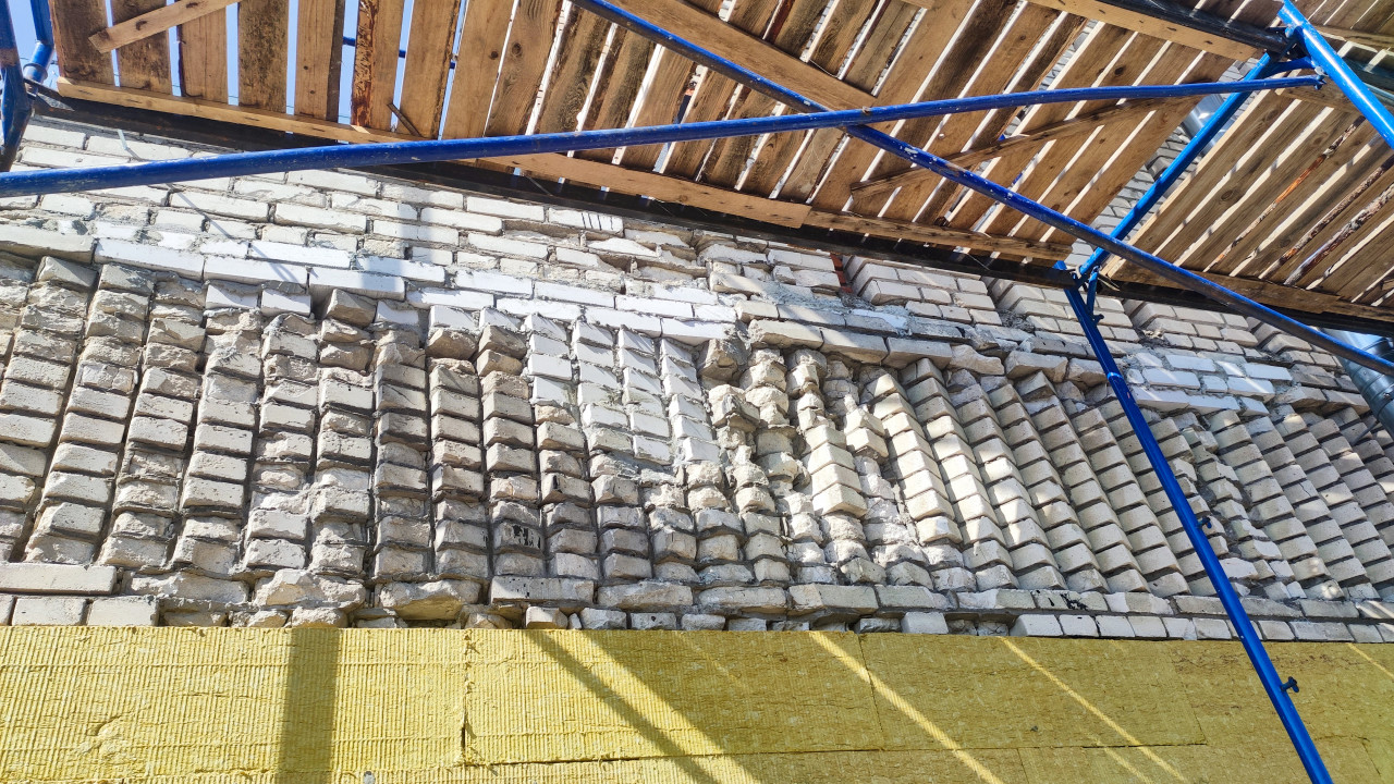 Верхняя часть кирпичного фасада под строительными лесами во время ремонта. Над стеной проходит настил из деревянных досок и синие металлические трубы лесов, от которых падают тени. Кладка местами разрушена: заметны выбитые кирпичи и неровные участки раствора, сохранился рельефный декоративный рисунок из выступающих элементов. Ниже по стене уже установлены жёлтые плиты минеральной ваты, подготовленные под дальнейшую отделку. Съёмка сделана днём при ясной погоде. Подходит для иллюстраций про обследование фасадов, ремонт кирпичной кладки и утепление зданий.