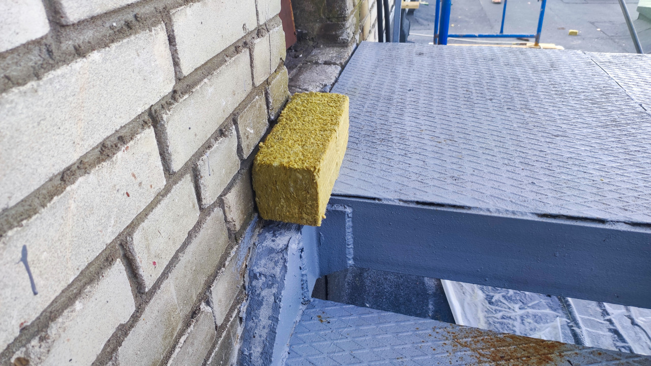 Обрезок минеральной ваты на металлической лестнице у кирпичной стены