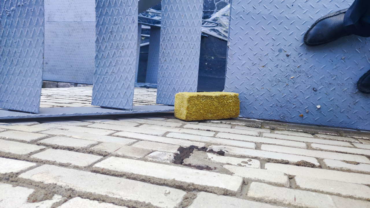 Низкий ракурс на металлической лестнице в зоне фасадных работ. У кирпичной стены на ступени лежит небольшой прямоугольный обрезок минеральной ваты, рядом установлены вертикально рифлёные металлические листы и элементы настила, образующие временный проход. В правой части кадра видна обувь рабочего на ступени, на поверхности заметны пыль, крошка и следы раствора. Фоном проходят синие металлические детали лестничной конструкции и участки защитного укрывного материала. Свет дневной, часть пространства в тени. Снимок подходит для иллюстраций про ремонт и обслуживание зданий, работу на высоте и организацию безопасного доступа с лестницей.