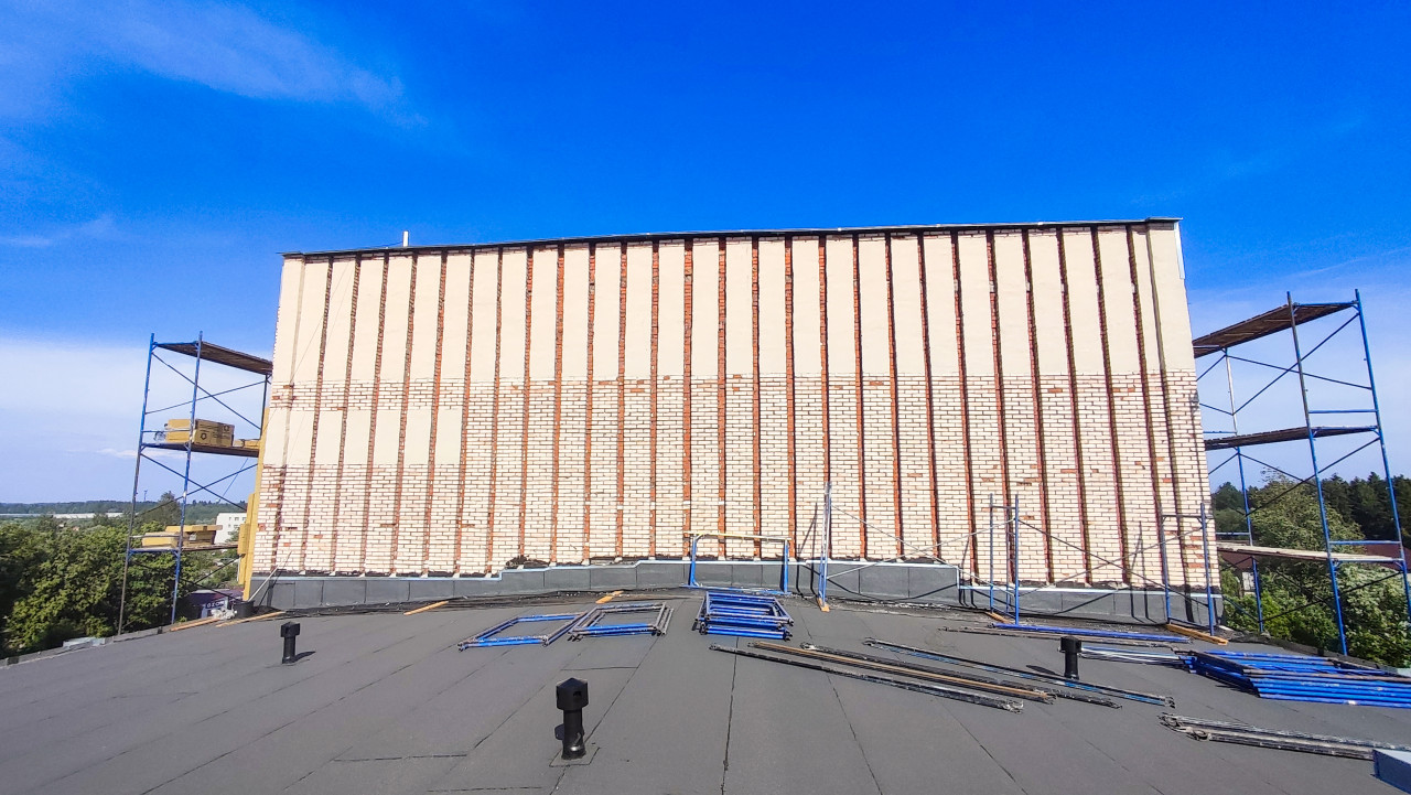 строительство ремонт реконструкция здание фасад строительные работы строительная площадка строительные леса высотные работы обслуживание здания капитальный ремонт плоская крыша кровля мембранная кровля битумная кровля кровельные работы вентиляция вентиляционные выходы аэраторы парапет кирпичная стена металлические конструкции разобранные леса монтаж демонтаж металлопрофиль рейки техника безопасности организация работ ремонт здания инженерные системы синее небо летний деньПохожие фотографии