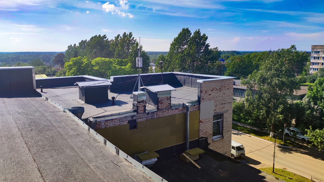 строительство ремонт реконструкция здание фасад строительные работы строительная площадка строительные леса высотные работы обслуживание здания город капитальный ремонт плоская крыша кровля кровельное покрытие парапет вентиляция вентиляционные шахты крышные зонты вентиляционные выходы кабели инженерные коммуникации водосток водосточная труба кирпичное здание утепление фасада теплоизоляция минеральная вата утеплитель строительные материалы ремонт примыканий вид с крыши деревья улица летний день организация работПохожие фотографии