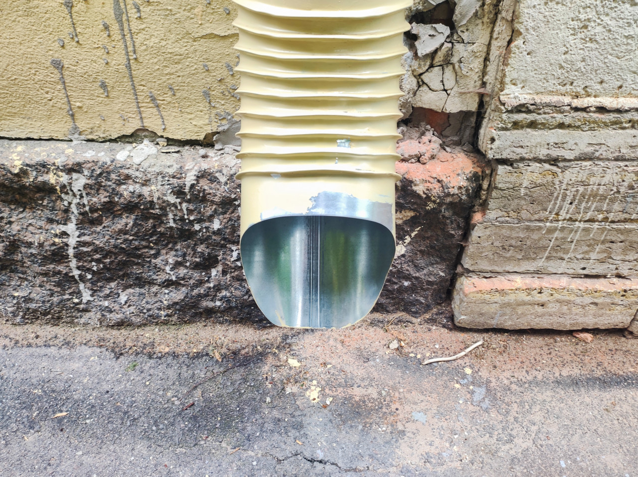 Нижний выпуск водосточной трубы с металлическим отливом у стены здания
