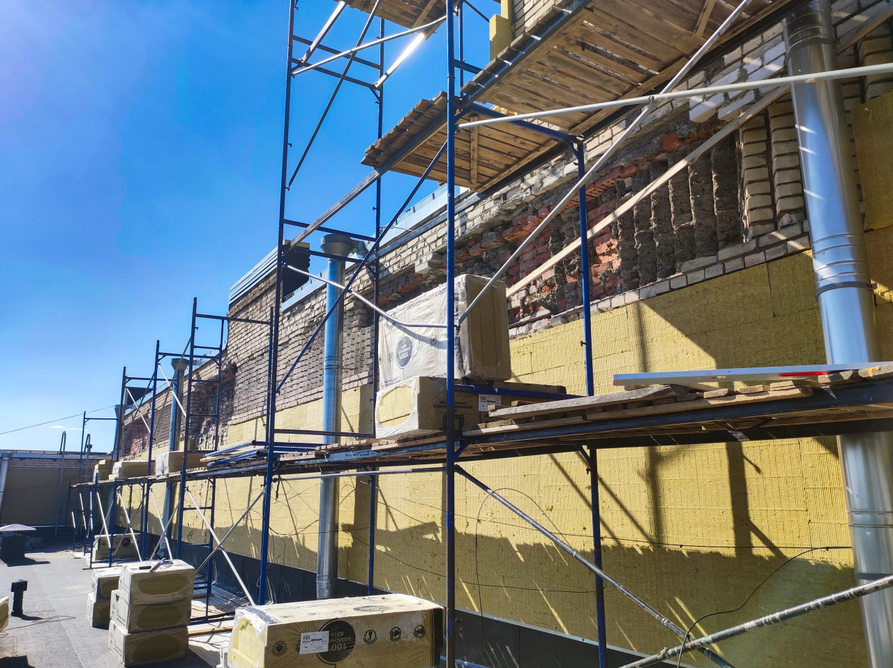 Общий вид участка работ на крыше: вдоль стены установлены синие строительные леса с настилами из досок, на фасаде закреплены плиты минеральной ваты, выше видны зоны раскрытой кирпичной кладки и ремонтируемые фрагменты. На настиле и кровле лежат упаковки утеплителя, уровень, деревянные доски и провода; рядом проходят металлические вентиляционные трубы. Погода ясная, свет жёсткий, тени от лесов читаются на утеплителе. Фото подходит для тем о капитальном ремонте, утеплении и модернизации зданий, организации стройплощадки и работ на высоте.