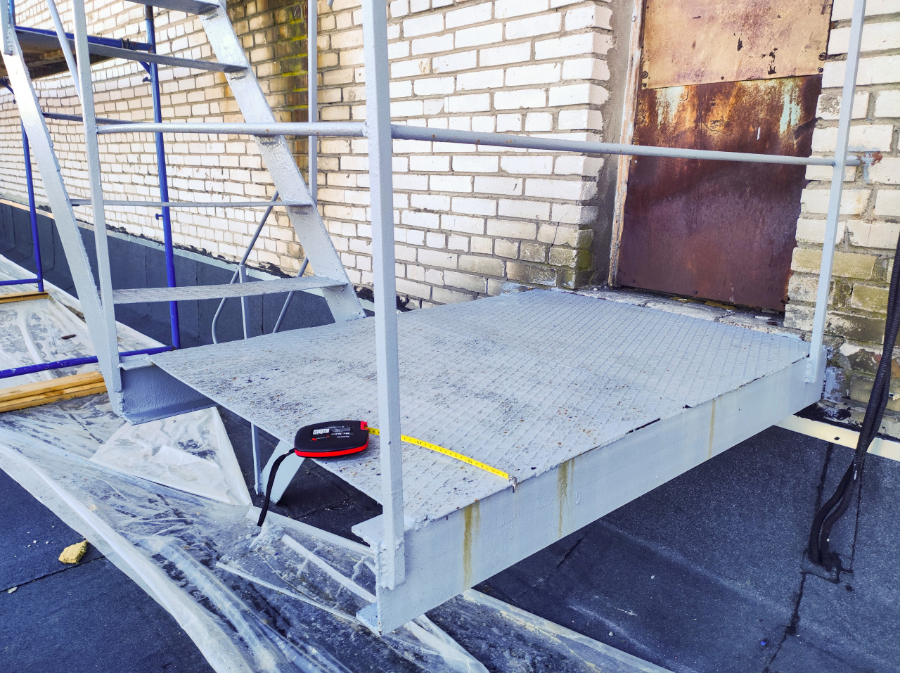 На фотографии показана стальная площадка с рифлёным настилом и ограждением, установленная у кирпичного фасада; к площадке примыкает марш лестницы. На настиле лежит измерительная рулетка с вытянутой лентой, что подчёркивает процесс замеров и контроля размеров. Справа видна старая металлическая дверь с коррозией и потёртостями, вдоль стены проходит чёрный кабель в гофре. Внизу заметны защитная плёнка и кровельное покрытие. Фото можно использовать для тем про монтаж лестниц, строительные измерения, ремонт и реконструкцию объектов.