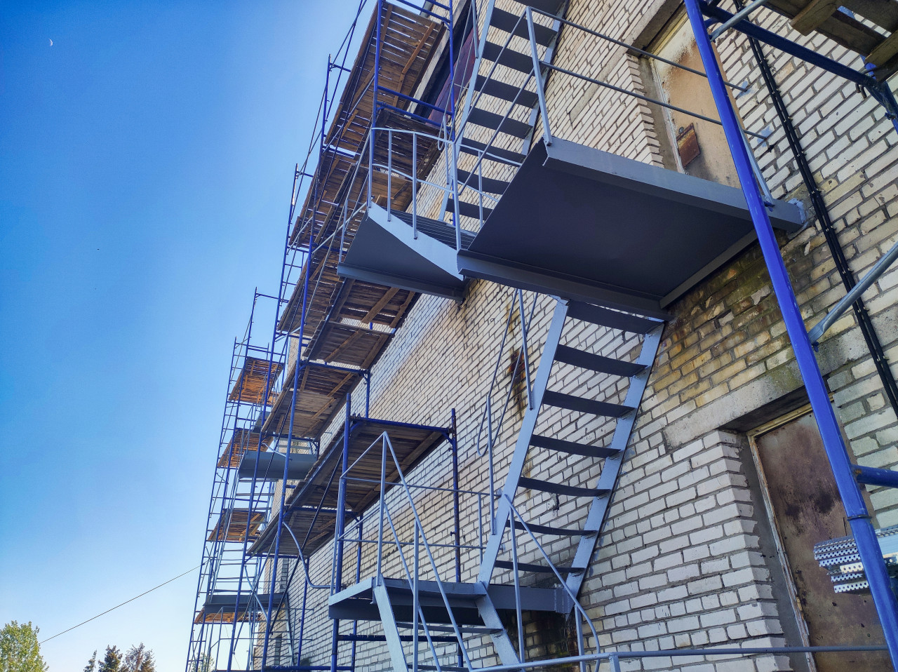 Наружная лестница с площадками на кирпичном фасаде в зоне строительных лесов