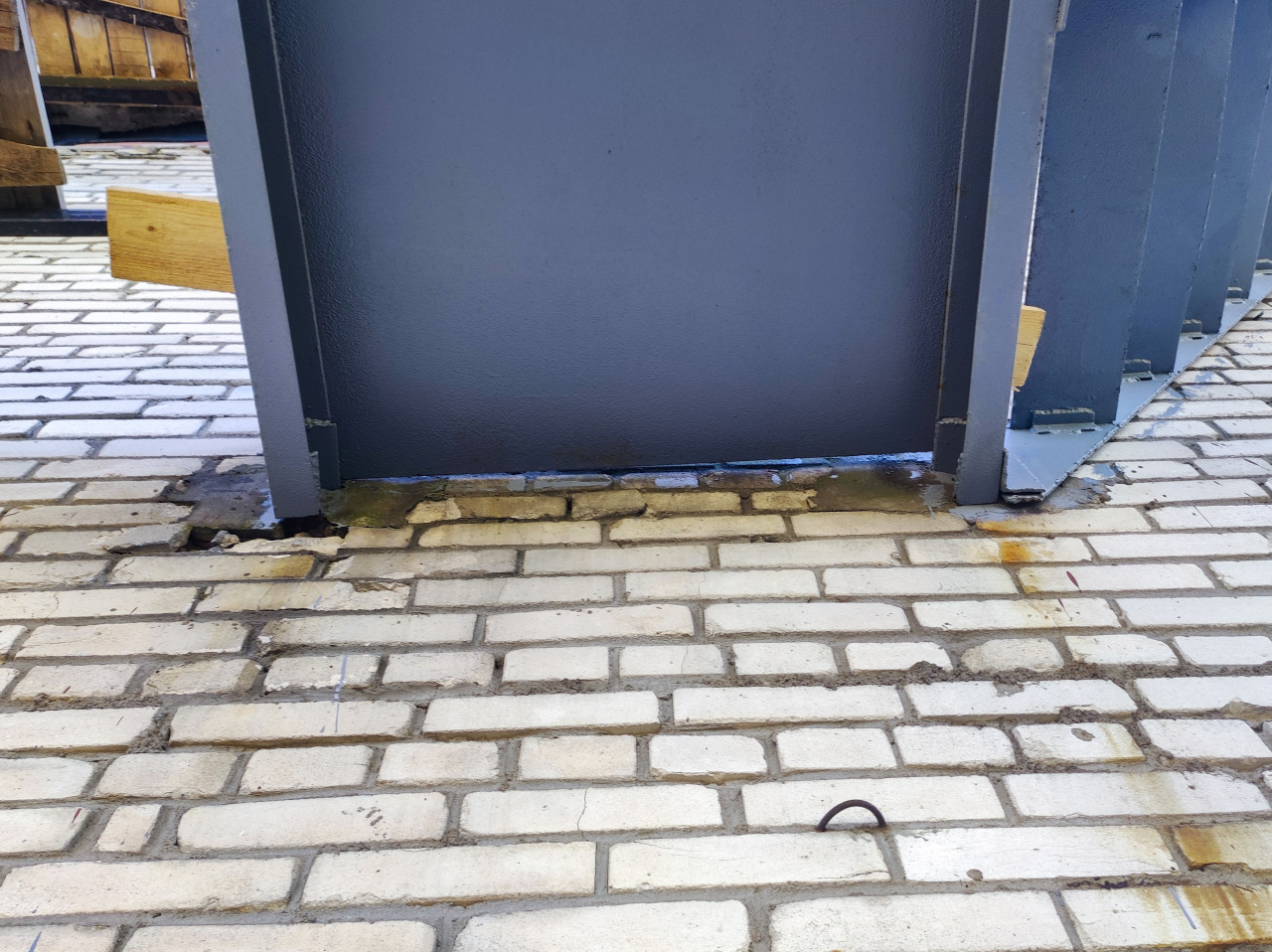 На фото зафиксирован крупный план основания металлической конструкции: вертикальная серая панель и стойки опираются на кирпичную поверхность, по низу видны следы раствора и влажные пятна. По бокам заметны деревянные прокладки или клинья, используемые при выверке положения элемента. В кладке присутствуют неровности швов, небольшие трещины и пятна загрязнений. Кадр передаёт технический характер монтажного узла и состояние материалов без дополнительных деталей. Снимок подходит для иллюстрации строительного контроля, монтажа металла, обследования узлов опирания и ремонтных работ.