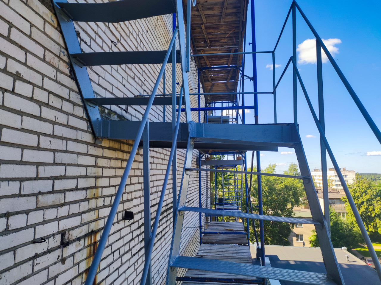 строительство ремонт реконструкция здание фасад строительные работы строительная площадка строительные леса высотные работы обслуживание здания кирпичная стена кирпичная кладка леса площадка лесов настил деревянные доски ограждение перила металлоконструкции стойки диагональные распорки лестничный марш работа на высоте техника безопасности городская среда жилые дома деревья зелень лето дневной свет голубое небо тени строительная организацияПохожие фотографии
