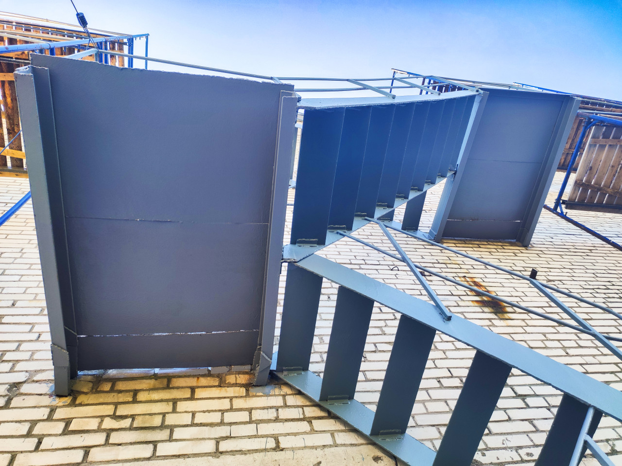 Вид снизу на наружную металлическую лестницу, закреплённую на кирпичном фасаде: в кадре нижняя сторона площадок и марша, ребра жёсткости и вертикальные стойки ограждений. Конструкция окрашена в серо-голубой цвет, местами заметны технологические стыки и кромки металла. По верхнему краю проходят перила, на фоне видны деревянные щиты и элементы лесов. Кирпичная кладка занимает нижнюю часть кадра, свет яркий, небо чистое. Использование: иллюстрации для тем про металлоконструкции, пожарные лестницы, монтаж и эксплуатацию зданий.