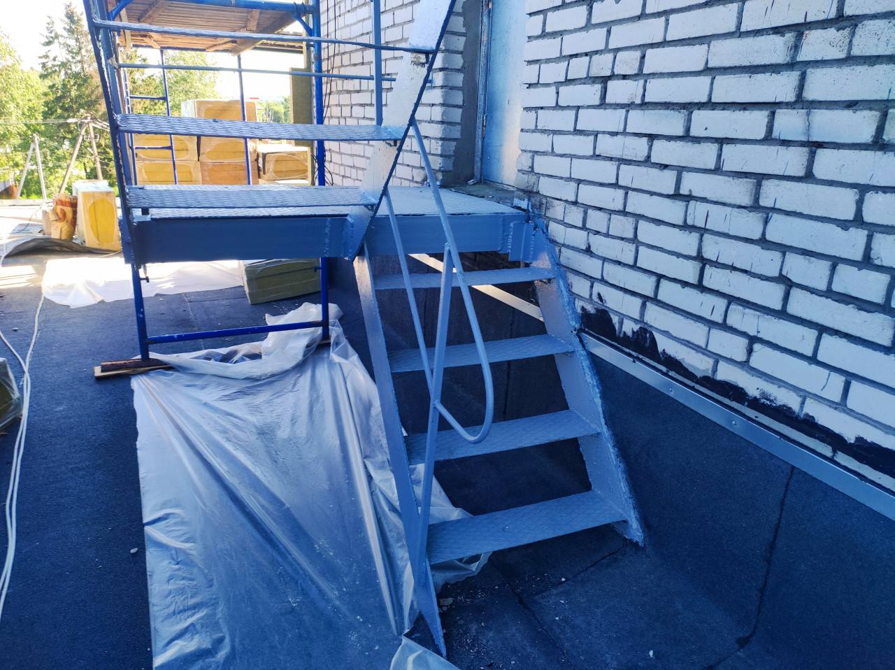 На плоской кровле установлена металлическая лестница с рифлёными ступенями и поручнями, ведущая на небольшую площадку у входа в надстройку. Кровельное покрытие выполнено рулонной гидроизоляцией, по поверхности лежит защитная плёнка и строительные остатки, по периметру видны участки примыканий к стене. Слева размещены строительные леса и пачки утеплителя, вдалеке просматривается зелёная территория. Яркий дневной свет подчёркивает фактуру металла и покрытия. Фото подходит для тем о ремонте кровли, организации доступа и безопасности работ; использование: отчёты, статьи, презентации.