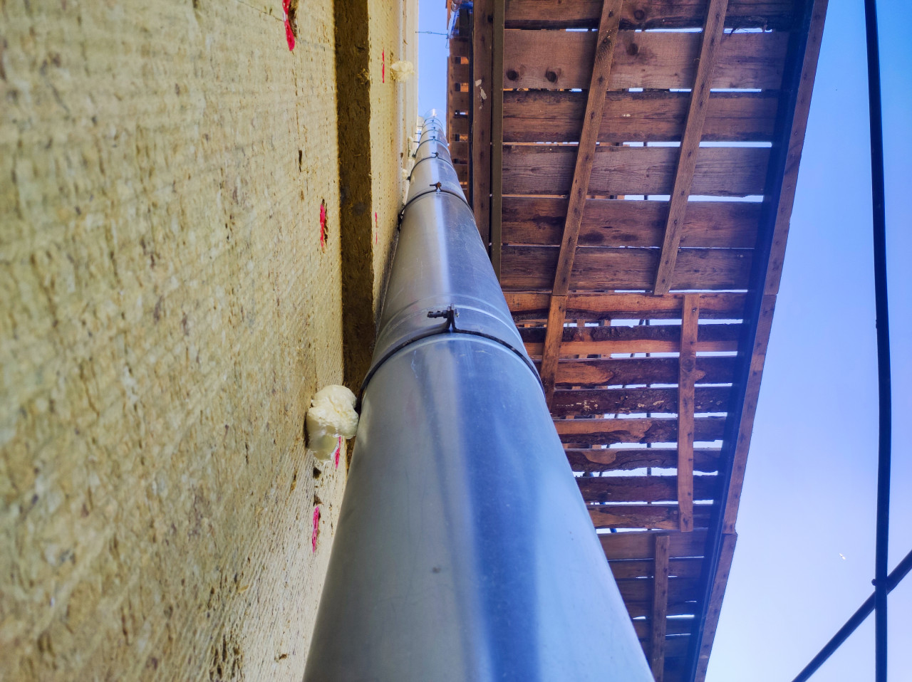 Крупный ракурс снизу: вдоль стены, закрытой минераловатным утеплителем, проходит металлическая водосточная труба, закреплённая хомутами. В зоне примыкания видны монтажные материалы, на поверхности утеплителя заметны следы крепежа. Над трубой расположен деревянный настил строительных лесов, на фоне просматривается голубое небо и элементы металлического каркаса. Фото подходит для материалов о монтаже и ремонте водостока, фасадном утеплении, креплении труб к стене и организации высотных работ на лесах.