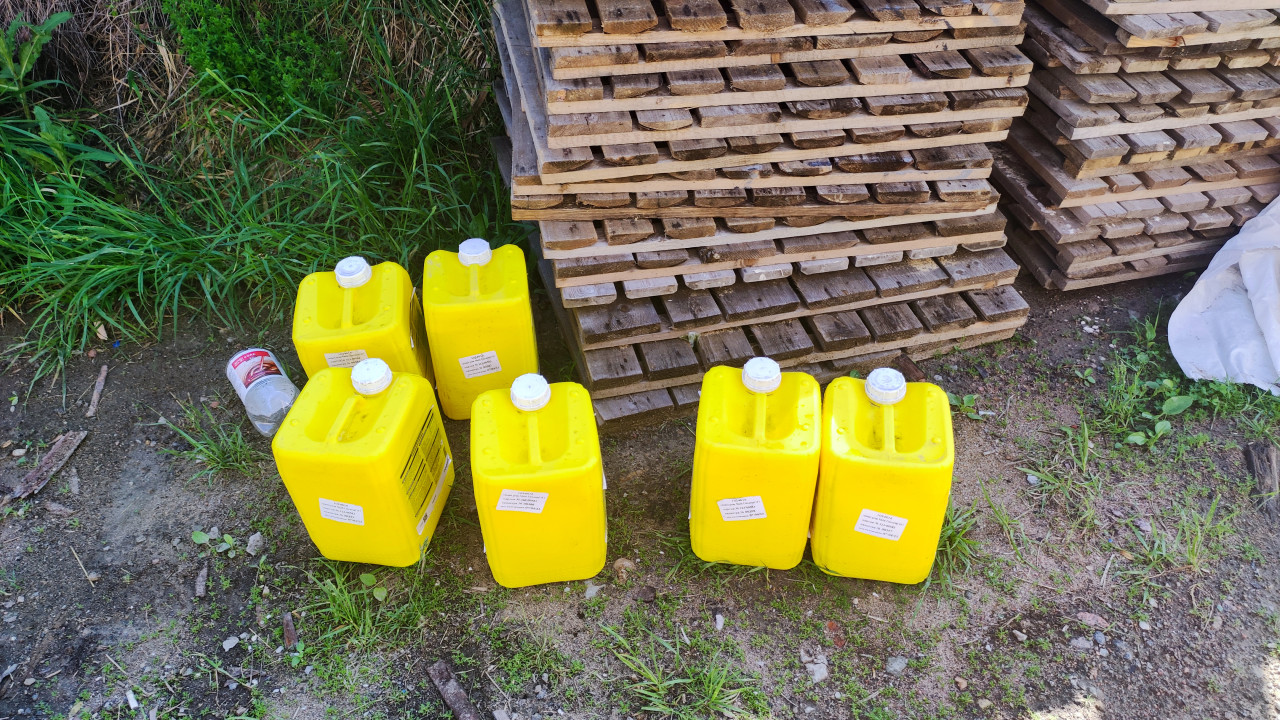 На грунтовой площадке у края травы стоят пять жёлтых пластиковых канистр с белыми крышками и наклеенными этикетками. Рядом сложены стопки деревянных паллет и досок, видна фактура древесины и просветы между рейками. На земле заметны мелкий щебень, следы грязи, сорняки и выброшенная пластиковая бутылка; справа лежит часть белого укрывного материала или мешка. Снимок передаёт бытовую сторону стройплощадки и хранение расходных материалов в таре. Подходит для тем про организацию строительства, строительную химию, складирование и технику безопасности на объекте.