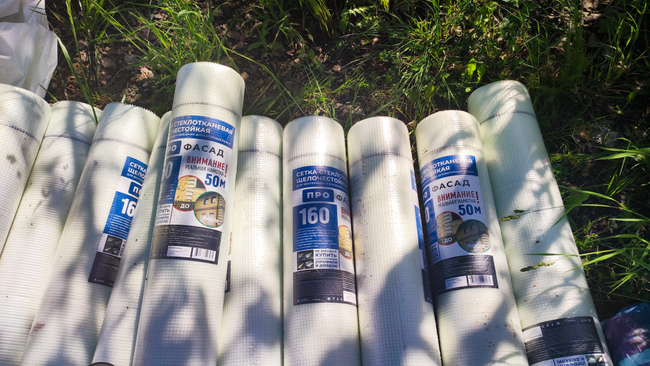 Рулоны стеклотканевой фасадной сетки на траве рядом со стройплощадкой